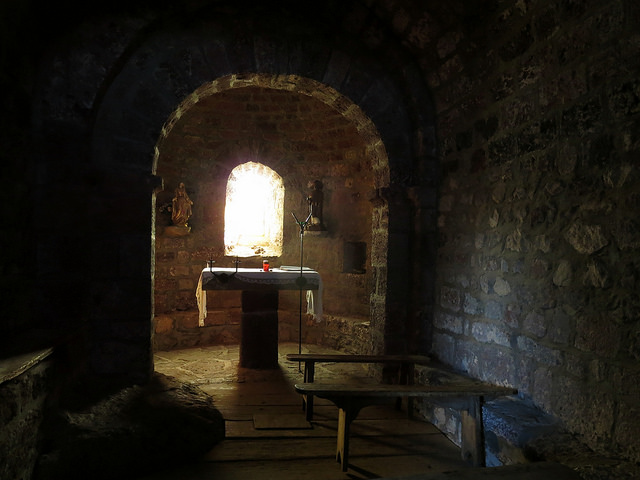 And yet there was nothing to keep us from scrambling up to explore. No gates or locked doors or “No trespassing” signs. There was no one else around. We shed our packs. While Eric climbed to the keep, I ducked under the low door to go into the chapel. A rough stone floor, with the rocks of the ground below breaking through in places, a few wooden benches, and—incongruously—what looked like a microphone stand.